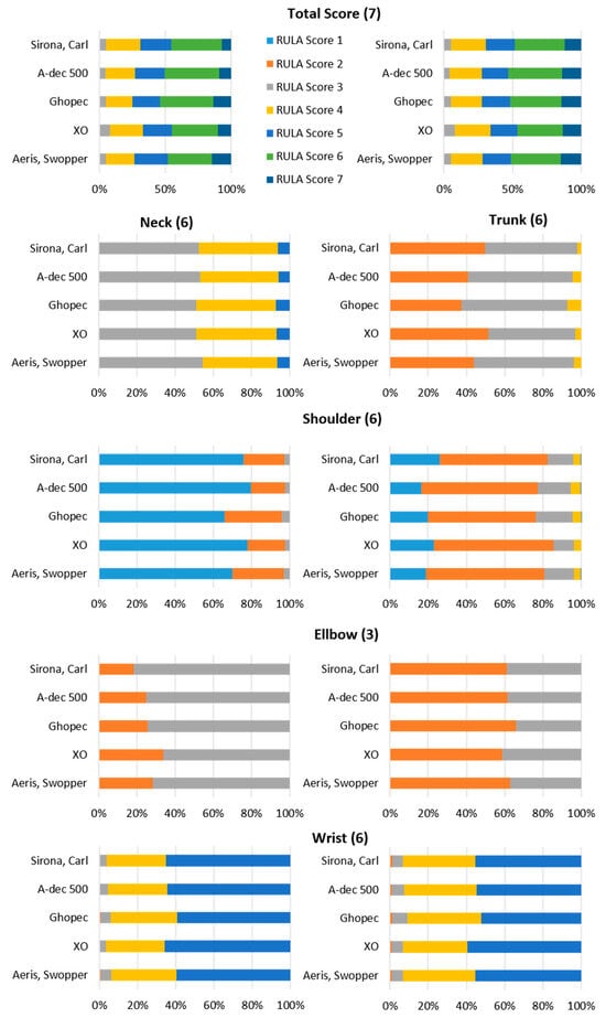 The ergonomic loads on the neck differ only slightly between the dental chairs analysed. All the chairs have a very low proportion of high stress values (RULA 5), while the stresses are relatively evenly distributed between moderate values (RULA 3 and 4). Slight differences can be observed in the trunk score. Chairs 1 and 4 show a slightly higher proportion of low stress values (RULA 2) and correspondingly lower proportions of RULA 3. Chair 3, on the other hand, shows a slightly higher proportion of RULA 4, indicating a slightly higher stress in the trunk. A striking result can be seen when looking at the shoulders (upper arm score), where there is a strong lateral difference. The right shoulder is significantly more stressed than the left, although the overall stress in both shoulders can be classified as low, as RULA values 1 and 2 predominate. There are only minor differences between the chairs analysed.
