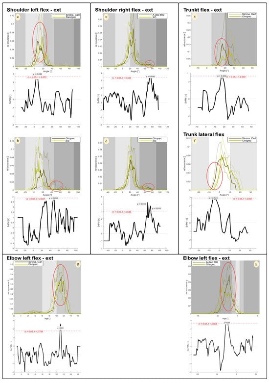Significant multiple comparisons between selected chairs of the relative occurrence of total joint angles and corresponding SPM analysis. (a,b) left shoulder (sagittal plane); (c,d) right shoulder (sagittal plane); (e) trunk (sagittal plane); (f) trunk (frontal plane); (g,h): left elbow (sagittal plane). Top image: abscissa = joint angle; ordinate = relative occurrence; grayscale = RULA score; thick line = median values; thin lines = 1st/3rd quartile. Bottom image: abscissa = joint angle; ordinate = t-values; red line = significance threshold. The red circles mark significant areas of joint angle and relative occurrence between chairs.