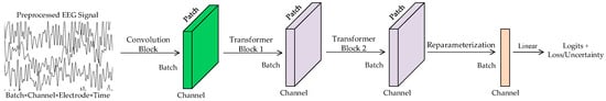 Further comparison with other existing models further validates the superiority of the DU-former model. For example, the intracranial EEG classification model based on CNN and Transformer proposed by Yu et al. [] uses CNN to extract local features, similar to the proposed model’s convolutional module design. The study also showed that introducing spatiotemporal convolutions effectively enhanced the performance of the Transformer in EEG signal classification. In contrast, DU-former improved the model’s classification accuracy and robustness by integrating convolutional modules, Transformer encoder modules, and data uncertainty learning.