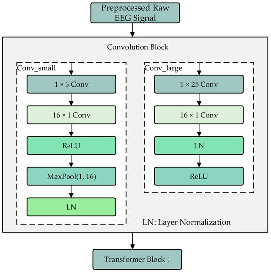 The convolution module consists of two branches, Conv_large and Conv_small, which are used to extract local and global features of the processed EEG signals, as shown in Figure 2. The Conv_large branch first uses a 1 × 25 convolution kernel to extract features along the time dimension, followed by a 16 × 1 convolution kernel to extract features along the electrode channel dimension. The results are then normalized and activated using ReLU. The Conv_small branch also uses a 1 × 25 convolution kernel to extract features along the time dimension, followed by a 16 × 1 convolution kernel to extract features along the electrode channel dimension. After ReLU activation, a max-pooling operation is performed to adjust the data dimensions to match those of the Conv_large branch, followed by layer normalization. The two branches use different sizes of convolution kernels to extract local and global features, and their outputs are fused as input to the Transformer encoder modules.