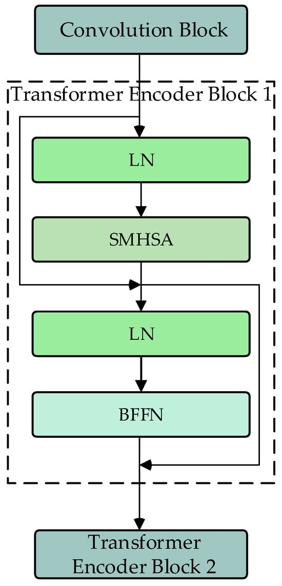 Flowchart of Transformer encoder block (SMHSA: separable multi-headed self-attention; BFFN: feed-forward network).