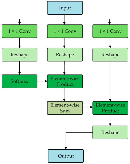 First, the input features are mapped to , , and matrices. Then, the matrix computes the inner product with the matrix via the softmax operation to obtain the context scores. Finally, these scores are weighted by the matrix to generate the attention vector, as shown in Equation (1).