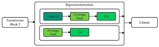 The reparameterization module, which consists of two branches, is inspired by methods used in other studies []. Branch 1 performs convolution, average pooling, and normalization operations to obtain the model’s distribution mean (). Branch 2 directly performs average pooling and layer normalization to obtain the distribution variance (). Through Gaussian reparameterization, the original features are reparametrized as embedded features with a Gaussian distribution.