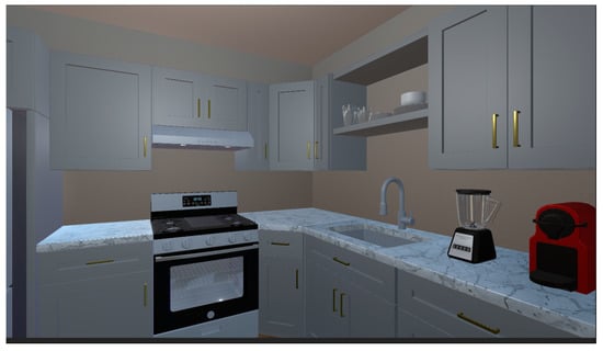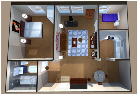 This paper adopts a virtual room as the training scene to enhance the sense of immersion and real-life experience in episodic memory training. The scene includes a living room, two bedrooms, a bathroom, and a kitchen. As shown in Figure 6, the scene’s layout strives to replicate a real family environment, thereby improving realism and immersion. During the training process, the items to be memorized are everyday objects, such as a pot, hanger, slippers, towels, etc. These items are randomly generated and placed in the scene before each training session.