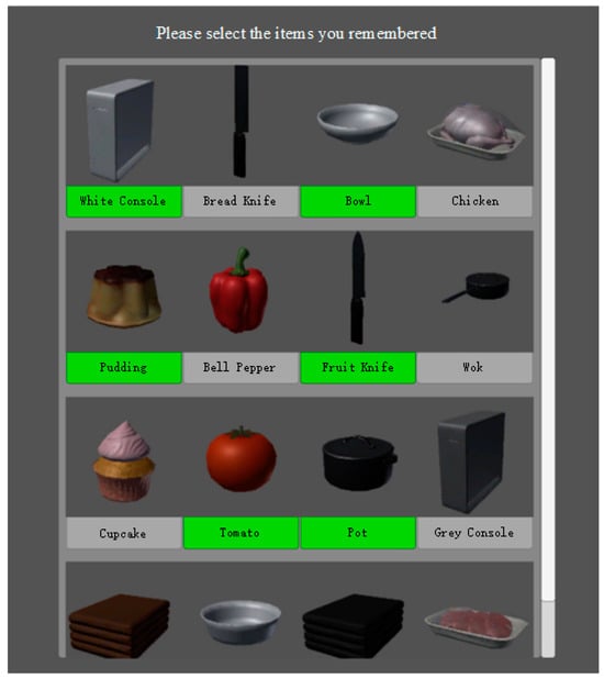 Object Recognition Phase: Figure 8 shows that this phase displays a series of object images, including target objects (those shown in the memory phase) and non-target objects (distractor objects). The ratio of target to distractor objects is 1:1, and the distractor objects are visually similar to the target objects. For example, if the target item is a blue towel, the distractor could be a red towel. Participants must identify the objects in the memory phase and mark the selected objects with a green icon. This phase does not require participants to recall the sequence of objects. The phase records the accuracy of the participants’ selections and the time taken.