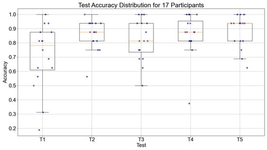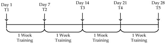 As shown in Figure 10, to evaluate the effectiveness of the episodic memory training system, a 28-day experiment was conducted. The episodic memory testing sessions were performed on Day 1 (T1) and at the end of each week (T2 to T5). The overall task schedule is displayed, where “Day” indicates the specific date, “T1” refers to the first testing session, and “Training” refers to the regular training sessions.