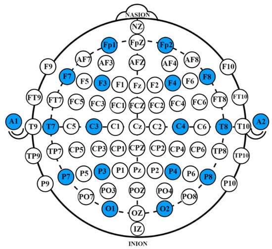 Electrode placement diagram. The specific electrode locations are shown in Figure 11, with the selected channels highlighted in blue.
