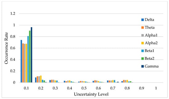 Additionally, the work by Deng et al. [], which uses data uncertainty learning in epilepsy EEG prediction, inspired this paper. Through Gaussian reparameterization, the DU-former model achieved data uncertainty learning. The training results demonstrated that the model maintained low uncertainty across all frequency bands, thereby enhancing the credibility of the classification results. This approach also significantly improved the model’s robustness, particularly in handling high-noise and complex signals, where the model showed good stability and interpretability. To further evaluate uncertainty modeling strategies, this paper implemented a Bayesian CNN using the same backbone as the CNN model used in Section 5.2. However, the Bayesian CNN achieved only around 50% classification accuracy in each frequency band, which was significantly lower than that of DU-former. This result suggests that the proposed Gaussian reparameterization-based uncertainty learning provides a more stable and effective approach for EEG classification.