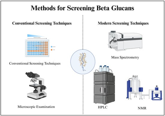 Overview of methods for screening β-glucans. Screening approaches are categorized into conventional and modern techniques. Conventional methods include chemical assays and microscopic detection. At the same time, modern techniques involve advanced analytical tools such as mass spectrometry (MS), nuclear magnetic resonance (NMR), and high-performance liquid chromatography (HPLC) for improved accuracy and sensitivity.