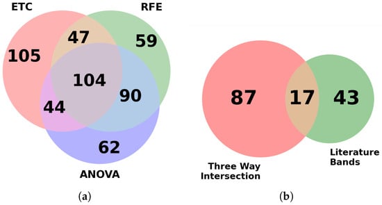 (a) Number of bands that were identified as important by the three feature selection algorithms. (b) Overlap between literature bands and the 104 bands common in (a).