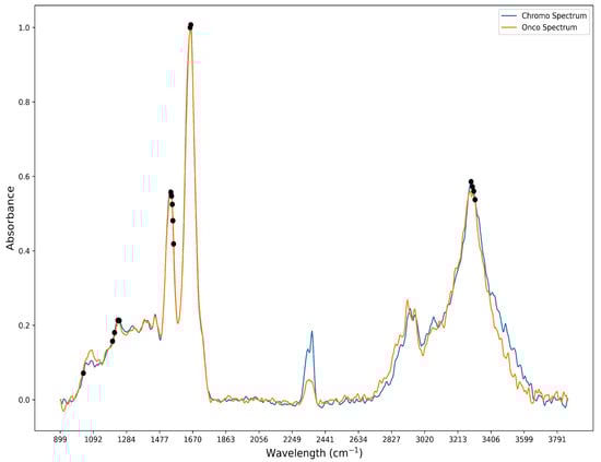 FT-IR spectra for ChRCC and Oncocytoma before band preprocessing. Black dots show an overlap between literature and feature selection for the 17 bands.