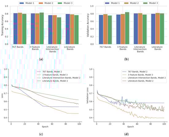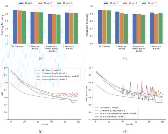 As highlighted in Figure 5, the 767 bands model showed the most consistent high accuracy and low loss values. This combination with Model 1 was the best performing out of all models evaluated, with a validation accuracy of 93.1%. The three feature selection algorithms model also showed slightly lower accuracy when compared to the 767 band model. The model with the highest performance with this combination was Model 1, with a validation accuracy of 85.2%. The literature and feature selection intersection bands model showed the lowest accuracy compared with all other band configuration models. Model 2 had the highest validation accuracy of 78.5%. The literature bands model had a comparable performance that was similar to the three-feature selection algorithm model. The best performing model for this combination was Model 1 with a validation accuracy of 83.0%. The training statistics for these best models over 100 epochs are shown in Figure 5.