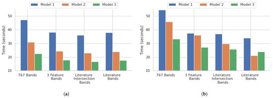 The performance of the different models demonstrated a few critical points within the scope of our research. The 3 feature selection algorithm bands with all the models showed that a significant reduction in the number of bands, down to those with the highest importance, shows a promising balance of both speed and accuracy. The reduction of the feature set down to 104, which is 13.56% of the original 767 bands, using the feature selection times of the 767 bands for all models, showed that they were reduced by approximately 21% for the 3 feature selection algorithm bands models, another key demonstration of the feasibility of this model. The literature bands, along with the literature and feature selection intersection bands for all models, had comparable training times to the 3 feature selection algorithm bands models, as shown in Figure 7. This shows that the adoption of DFIR-based approaches will predominantly enhance clinical relevance and translatability in addition to considerably reducing the number of resources that would be needed for band processing. The training didn’t further reduce the training times, but it did negatively affect the accuracy of the models.
