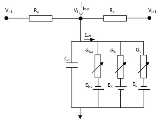 The entire nerve is considered to be spatially discretized as a one-dimensional distributed system, represented by nodes connected via axonal resistances. The related ionic channels are represented in the form shown in Equation (1). In the model representation shown in Figure 1, Ra and Cm represent the axonal resistance and membrane capacitance, respectively. Finally, Vi represents the internal membrane potential at the node of interest, while Vi−1 and Vi+1 represent its neighboring nodes. The equation for AP propagation is given by
