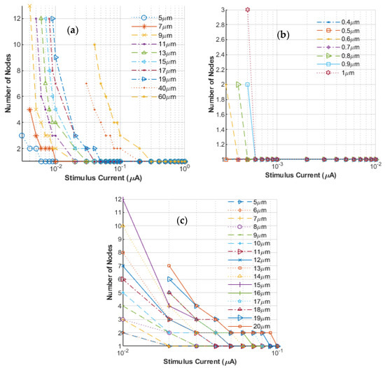 Simulations for AP triggering were carried out based on the model presented in the previous section. The goal was to determine the activation current thresholds in an unmyelinated nerve and to numerically quantify any changes in the value brought about upon using multiple electrodes. To this end, nerves of different sizes, with radii ranging from 0.4 μm to 60 μm, were simulated. While unmyelinated nerves in humans are typically under 1 μm, this study explores the mechanics of nerve activation for unmyelinated nerves across species where nerves of significantly larger cross-sections exist. However, for the sake of clarity and completeness, we also provide a few results specific to the human nerve diameters. The results obtained are shown in Figure 2a–c with the number of stimulating nodes plotted against the threshold stimulus current required to just launch an AP. For convenience, a semi-logarithmic scale was chosen, since the threshold currents varied over a considerable range. In all cases simulated, the stimulus was taken to be a DC pulse that had a fixed 1 ms duration. The time for current injection was kept fixed for consistency across each run for the various cases of differing parameters, such as nerve diameters, the number of stimulating nodes used, and the stimulus amplitude chosen for the different simulations. Each node in the plot represents a 1 mm region The features evident from the curves shown in Figure 2a–c are as follows: (i). In general, as perhaps might be expected, the injection current needed to initiate an AP decreases as the number of stimulating nodes increases. (ii) Since the number of stimulating nodes is an integer variable, the curves are discrete and exhibit step-like behaviors. The curves eventually flatten out when the situation comes down to just one stimulating node, and the least current value at the verge of this flattening should be taken as the true indicator of the current threshold. (iii) The triggering current needed to initiate an AP is seen to depend on the nerve size, with smaller nerves requiring lower stimulating excitation. Again, this is in line with qualitative expectations. (iv) Finally, even though one can try to increase the number of electrodes that might stimulate the neural system, the injection current required does not scale. In fact, it is predicted to diminish ever so slowly with an increasing number of triggering points. Thus, the benefit of requiring an ever-smaller current trigger is seen to reach a limit, with a lower bound dependent on the neural fiber.