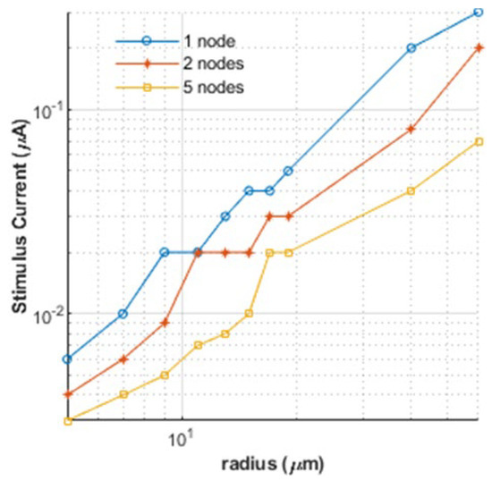 For completeness, the numerical predictions of changes in the stimulus current with nerve radii are given in Figure 4. The non-linear relationship that is inherent from Equation (1) between the nerve radius and the successful activation (determined here by a minimum transmembrane potential of 80 mV) required that logarithmic scales be used on both axes in Figure 4 to produce sufficient visual fidelity. Due to the discreteness of the stimulating node numbers that go into the calculation, the plots are not smooth. Figure 4 shows the results for three different numbers of stimulating electrodes. In general, the highest value of Iinj is predicted for the stimulation of the least number of nodes for any given size. In addition, as expected, the requisite current increases as the nerve radius increases in dimension.