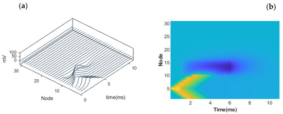 Having discussed the results for the AP initiation of nerves of various sizes, stimulated by different numbers of current injecting electrodes, the next set of results focused on blocking a propagating AP in an unmyelinated nerve. This was accomplished by first launching an AP from some point within the one-dimensional distributed unmyelinated nerve system based on an injecting current trigger. Next, a second interruption pulse was applied at a location downstream. In the results shown in Figure 5a,b, the separation between the initiation point and the interruption signal was taken to be 6 mm, while the nerve radius was 12.5 μm. Figure 5a reveals a three-dimensional result of the propagating voltage wave versus position (in terms of integral node numbers) and time. It shows the launch of an AP wave (from node number five), which starts propagating bilaterally in two opposite directions. The voltage values of the propagating AP wave are included in the figure. The interruption pulse was applied at node eleven. The result in Figure 5a shows the AP coming to a stop as it passes the interruption point. A better visualization is seen in Figure 5b which is a two-dimensional view. The upper branch of the symmetric and bilateral AP wave launched is seen to stop upon reaching the interruption location.