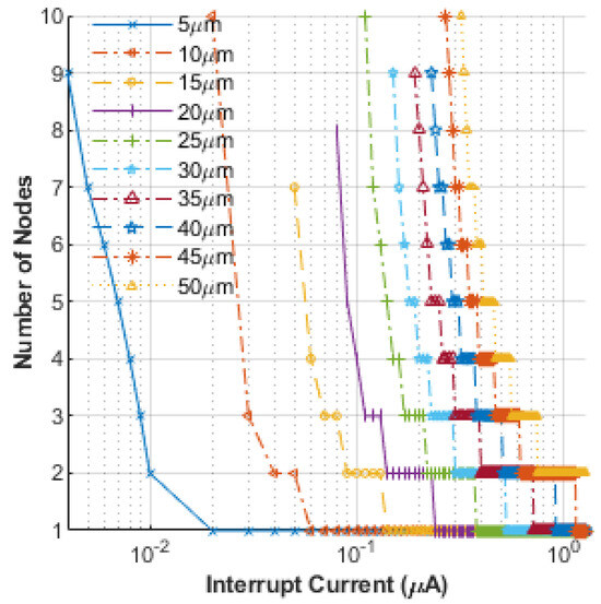 Next, the possible effects of applying interruption signals over multiple nodes of a nerve segment were probed to evaluate any possible reductions in the requisite interruption amplitude. In these simulations, all interruption signals were taken to be identical and concurrent, i.e., they all were assigned the same amplitude, time duration, and step function waveform. Thus, the interruption zone was expanded over larger regions to evaluate any possible reductions in the intensity of the interruption amplitude. The results obtained are shown in Figure 6. Each node in the plot represents a 1 mm region. The predictions shown are for varying nerve radii ranging from 5 μm to 50 μm. Given the large range of stimulus currents (0.001 µA~5 µA), a semi-logarithmic scale is used for the plot. The results reveal that the interruption current required to achieve an AP block can be reduced as the number of nodes over which the interruption signal is applied is expanded. As may be expected, the smaller-sized nerves require the smallest interruption signal intensity. For computation purposes, a nerve segment was considered to block an incident AP if the transmembrane potential did not exceed 20 mV for any node in the interruption zone or any region further downstream. In addition, it was set up such that the interruption signal (linked to the stimulus signal) started as soon as the upstream excitation pulse ended, and it remained in effect till the end of the simulation. This result is important and would have practical relevance since it points to the possibility of arresting APs with a much lower blocking stimulus intensity by using multiple nodes. The lower intensity signals are indicative of a safer and more reliable approach to induce AP blockage.