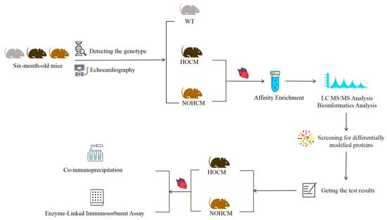 The HOCM mice, NOHCM mice, and WT mice were all male and placed in the same cage at 6 months of age; all of them had the same body weight (p = 0.844) and tibia length (p = 0.576). Compared to the WT mice, the HOCM mice and NOHCM mice had a higher heart weight (p < 0.05), ratio of heart weight and body weight (p < 0.05), ratio of heart weight and tibia length (p < 0.05), and MLVWT (p < 0.05). Compared to the WT mice and HOCM mice, the NOHCM mice had a higher LVEF (p < 0.05). Compared to the WT mice and NOHCM mice, the HOCM mice had a higher LVOT-PG (p < 0.05) (Table 1; Figure 2).