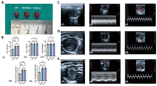 Cardiac samples and ultrasound images of HOCM mice, NOHCM mice, and WT mice. (A) Cardiac samples of HOCM mice, NOHCM mice, and WT mice. (B) Cardiac sample charts: (b1) heart weight; (b2) tibia length; (b3) body weight; (b4) heart weight/tibia length; (b5) heart weight/body weight. (C) Echocardiography of WT mice: (c1) echocardiography of short axis section of the left ventricle; (c2) echocardiography of M-mode; (c3) echocardiography of left ventricular long axis section to measure LVOT-PG. (D) Echocardiography of NOHCM mice: (d1) echocardiography of short axis section of the left ventricle; (d2) echocardiography of M-mode; (d3) echocardiography of left ventricular long axis section to measure LVOT-PG. (E) Echocardiography of HOCM mice: (e1) echocardiography of short axis section of the left ventricle; (e2) echocardiography of M-mode; (e3) echocardiography of left ventricular long axis section to measure LVOT-PG. HOCM, hypertrophic obstructive cardiomyopathy; NOHCM, non-obstructive hypertrophic cardiomyopathy; WT, wild-type; LVOT-PG, left ventricular outflow tract pressure gradient. ns, p > 0.05; ** p < 0.01; **** p < 0.0001.