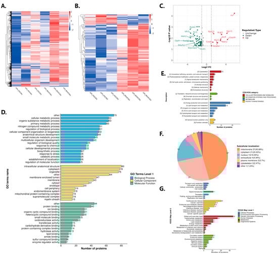 A total of 2710 proteins and 105 lactylation sites were identified in this study (Figure 3A). The PCC and PCA showed a better correlation and reproducibility of the samples (Figure S1A,B). The overlap in the PCA may be due to the fact that the two groups were mice of the same age carrying the same type of mutation and both had the HCM phenotype. The LVOT-PG and LVEF were significantly different between these two groups. In the HOCM mice’s myocardial tissues, there were 12 lactylation up-regulation sites with 12 up-regulated lactylated proteins and 93 lactylation down-regulation sites with 73 down-regulated lactylated proteins (Figure 3B). The volcano plots showed statistically significant levels of lactylation for these lactylated proteins among the HOCM and NOHCM groups (Figure 3C). The analysis of the function of differentially modified proteins using GO secondary classification, subcellular localization classification, COG/KOG functional classification, and KEGG functional classification revealed that the differentially modified proteins were mainly focused on energy metabolism processes in mitochondria (Figure 3D–G).