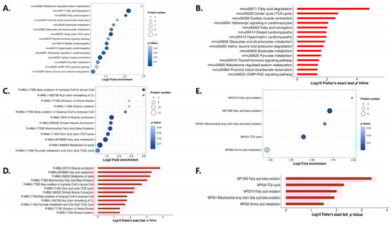 After that, we performed an enrichment analysis at three levels including the KEGG pathway (Figure 4A,B), Reactome (Figure 4C,D), and WikiPathways (Figure 4E,F). We found that the differentially expressed modified proteins were mainly concentrated in fatty acid metabolism and the tricarboxylic acid cycle (TCA). Meanwhile, in the analysis of the KEGG enrichment pathway, we found that, in addition to significant changes in energy metabolism-related pathways, the hypertrophic cardiomyopathy pathway and adrenergic signaling in the cardiomyocyte pathway were also significantly changed.