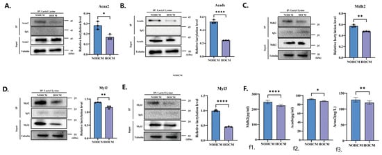Experimental verification results of enzymes and proteins that are significantly modified by lactylation. (A–E) Hearts from HOCM mice and NOHCM mice were lysed and immunoprecipitated with Acaa2 antibody (A), Acads antibody (B), Mdh2 antibody (C), Myl2 antibody (D), Myl3 antibody (E) or control IgG, followed by detection of lactyl lysine. (F) Functional verification of enzymes Mdh2 (f1), Acacds (f2), and Acaa2 (f3). * p < 0.05; ** p < 0.01; **** p < 0.0001.