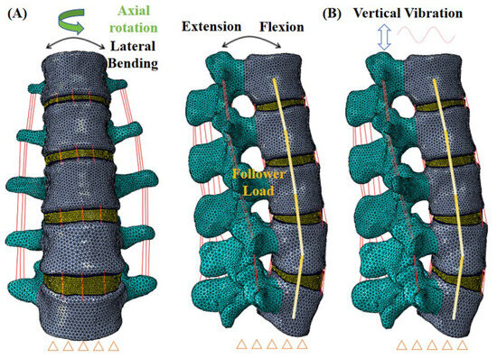 - Zhang, C.; Guo, L.X. Prediction of the biomechanical behaviour of the lumbar spine under multi-axis whole-body vibration using a whole-body finite element model. Int. J. Numer. Methods Biomed. Eng. 2023, 39, e3764. [Google Scholar] [CrossRef]