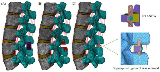 FE models of various interspinous process devices: (A) L3–L4 Wallis; (B) L3–L4 Coflex; (C) L3–L4 IPD-NEW.
