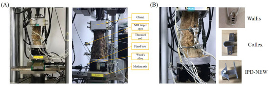 The study was conducted using the MTS Bionix Spine Simulation Machine. The lower end of the lumbar spine was secured in every direction using Wood’s metal, while torque was exerted at the L1 level via a hydraulic mechanism, as depicted in Figure 4A. The testing environment was maintained at an ambient temperature of 23 °C with a humidity range of 35–80%. Periodically, 0.9% saline solution was applied to the specimens to maintain their hydration [28]. Each lumbar segment was equipped with an NDI marker comprising four target points, with the segment’s position defined by the NDI marker’s coordinates. A 280 N compressive force was aligned with the lumbar spine’s curvature, succeeded by a 7.5 Nm torque at the L1 segment to replicate motions of flexion, extension, lateral bending, and axial rotation [18], at a rate of 0.1° per second. Each motion was conducted three times, with the ROM being documented, averaged, and analyzed. Initially, specimens were assessed in their intact state, followed by tests with the Wallis, IPD-NEW, and Coflex implants at the L3–L4 level, as shown in Figure 4B.
