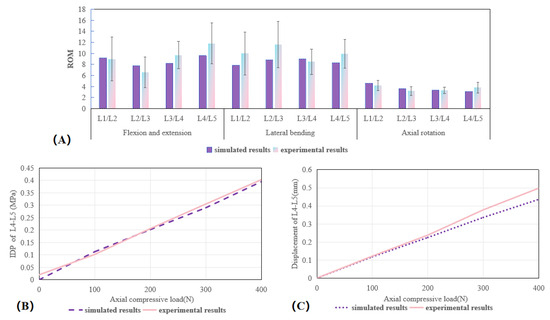 Verification of the lumbar model: (A) ROM for L1–L5 spinal segments; (B) IDP at the L4–L5 level; (C) axial displacement of the L4–L5 segment.