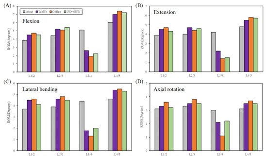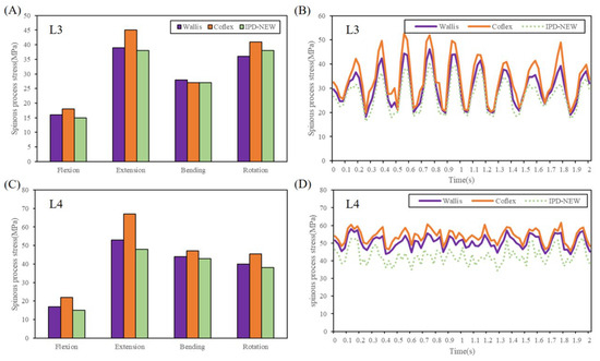 In conditions of static loads, Figure 10A,C showed the predicted results of spinous process stress. In contrast to both Wallis and Coflex, IPD-NEW resulted in a reduction in stress on the spinous process in all types of motion except for axial rotation. For the L3 segment, the stress on the spinous process with IPD-NEW was slightly greater than that observed with Wallis during axial rotation.