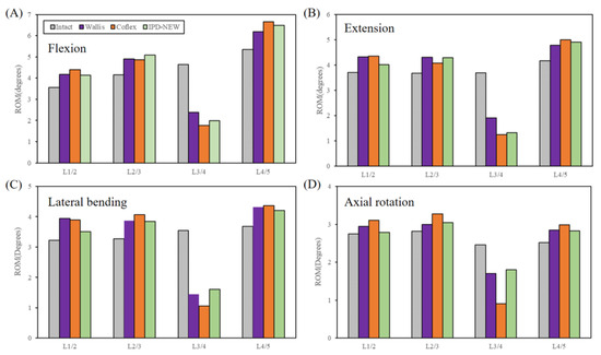 Figure 7 presents the anticipated ROM for each spinal segment. The FE outcomes were found to be 5–26% less than the in vitro data. Nevertheless, compared among IPD-NEW, Wallis, and Coflex, the trends of the simulated results were consistent with the cadaveric experiment.