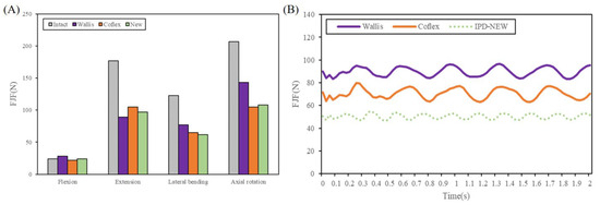 For dynamic loading conditions, the FJF’s dynamic responses are shown in Figure 8B. Table 2 summarizes the maximum and minimum values along with the vibration amplitudes. IPD-NEW demonstrated the lowest dynamic responses of FJF during vertical vibrations when compared to Wallis and Coflex.