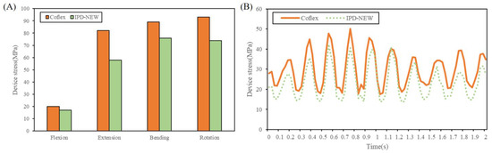 In conditions of static loads, Figure 9A compared the device stress of Coflex and IPD-NEW. Wallis was not compared because its main material (PEEK) was different from Coflex and IPD-NEW (Ti6Al4V). Compared with Coflex, IPD-NEW decreased the device stress by 15%, 29%, 15%, and 20% in flexion–extension motion and bending–rotation motion, respectively.