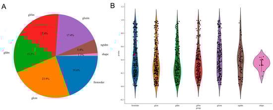 Radiomics features. (A) Proportions of the features. (B) Corresponding p−value results for the extracted features.