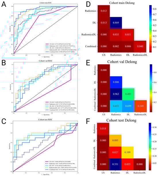 Comparison of ROC Curves and Delong Test results across training, validation, and test cohorts. (A–C) illustrate the ROC curves for the US, Radiomics, DL, RadiomicsDL, and combined models across training, validation, and test cohorts, respectively. (D–F) display the corresponding Delong test results as heat maps for each cohort, highlighting the statistical significance levels between the model comparisons. Color gradients represent p-values, with lower values indicating greater statistical significance.
