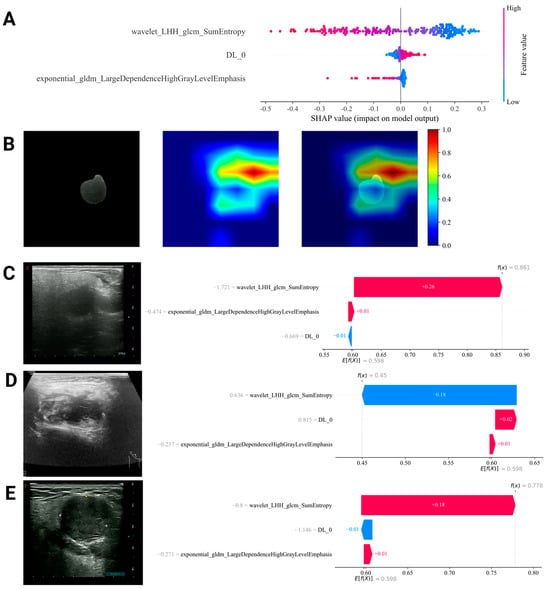 SHAP interpretability was applied to the RadiomicsDL model, and the SHAP Summary Plot (Figure 4A) was generated. The results showed that, among the three features in the model (Wavelet_LHH_glcm_SumEntropy, Exponential_gldm_LargeDependenceHighGrayLevelEmphasis, and DL_0), the radiomic feature Wavelet_LHH_glcm_SumEntropy had the highest impact on the model’s predictions. Additionally, higher values of the two radiomics features were associated with a greater likelihood of primary tumors, whereas DL_0 showed the opposite relationship. SHAP waterfall plots, as shown in Figure 4C–E, are used to explain the prediction process of selected representative lesions. Grad-CAM heat maps were generated from the average pooling layer of the trained ResNet50 model to visualize the ROI in the ultrasound image (Figure 4B).