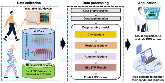 Schematic overview of the BBS assessment system. There are three main steps: data collection, data processing, and application. The orange line in the data collection shows the components of the wearable IMU device. The black lines in the data processing indicate which modules the data were processed through.