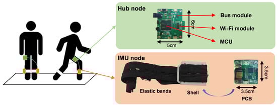 The hardware of this system included IMU devices. In order to minimize the impact of muscle movements on data collection during walking, the wearable IMU device was equipped with a hard shell created by 3-D printing. The outer side of the shell was secured to the human body by elastic bands to prevent sliding. The inner side of the shell contained the IMU node, which consisted of self-developed printed circuit board (PCB) [15]. This device also included a hub node to receive and transmit data from the IMU nodes to the host computer. Nodes were connected to each other by data cable. Figure 2 is a schematic diagram of the composition of a wearable IMU device, two IMU nodes were worn on the right and left calf of a person, and the hub node location was not required and was usually placed in the pocket.