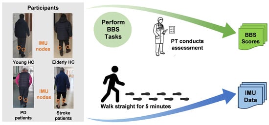 Two types of data were collected during the data collection process. Firstly, the three-axis acceleration and three-axis angular velocity data collected by the IMU device on humans during walking were used to build the gait database. Then, the clinical BBS scores that were determined by a PT for each participant were recorded as the ground truth. During data processing, the gait dataset and scale scores were fed into the deep learning model for training. The final system can calculate the user’s BBS scores based on the walking data and be applied to assist healthcare physicians as well as patients in their own health monitoring [14].
