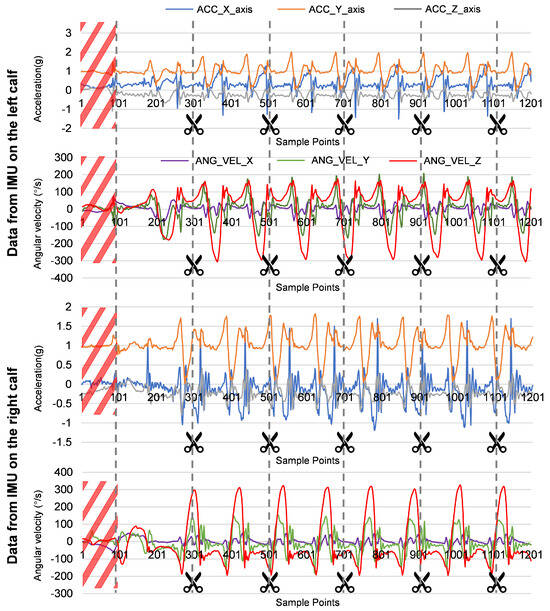 Example of the process of gait data segmentation. Inside the red slash box is the data to be deleted. The black dotted line means segment data in a fixed window size of 2 s.