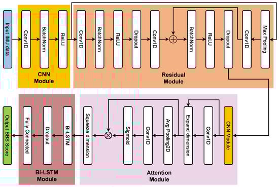In this study, a model combining CNN and Bi-LSTM based on the Attention module was used to train and analyze the gait dataset and finally calculated the BBS score. The details of this model were shown in the Figure 5. It mainly consisted of four modules: CNN module, Residual module, Attention module, and Bi-LSTM module. The IMU data was processed sequentially through the four modules to output the predicted BBS scores.