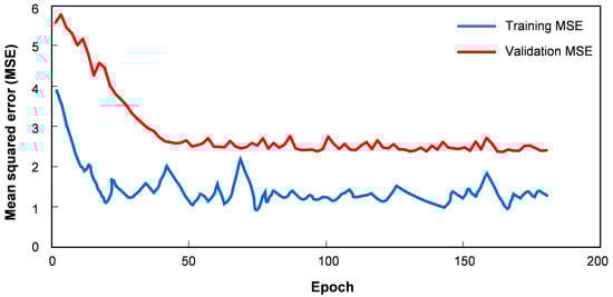 The Adam optimizer was utilized with a learning rate of 0.001, and the mean squared error served as the loss function. Ultimately, a batch size of 64 and 200 epochs were chosen for training the deep learning model. Figure 6 showed the learning curve of the training and validation loss (MSE). Early stopping method is implemented, we set stopping halts training when validation loss stopped improving for 20 epochs. The training stopped at epoch 187 due to no improvement after a patience of 20 epochs, the optimal epoch would be 167.
