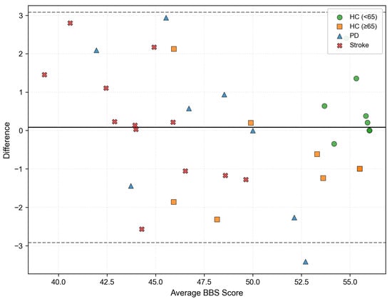 A Bland–Altman plot comparing the ground truth BBS scores with the BBS scores estimated by the proposed model. The solid black line indicates mean difference, and gray dotted lines represent 95% limits of agreement.