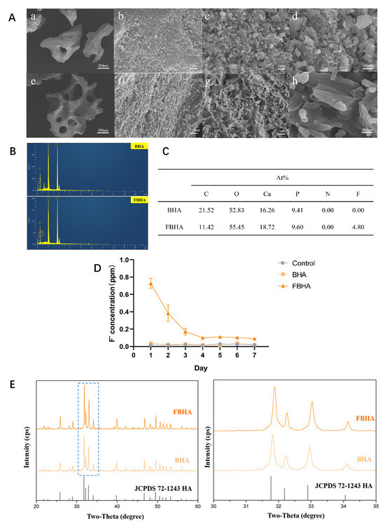 Characterization of fluorinated porcine hydroxyapatite. (A) SEM images displayed a spherical-shaped crystal of BHA (a–d) and a more rectangular crystal in FBHA (e–h), (B,C) EDS showed fluorine and other elemental distribution, (D) fluoride ion daily release showed a gradually reduced and sustained release of fluorine ion in FBHA, (E) XRD revealed a synchronous rightward shift of peaks in FBHA. Yellow circle in (B): Fluorine element; Blue dashed area of left figure in (E): Enlarged view shown at right.