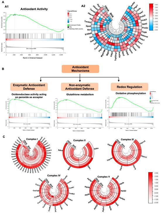 RNAseq analysis revealed the potential mechanisms by which FBHA inhibits the M1 polarization of macrophages. (A) GSEA (A1) and Associated Clustering Heatmap (A2) showed that, compared to PHA, the pathway of antioxidant activity of FBHA was significantly promoted. (B) The antioxidant mechanism involved several pathways, including oxidoreductase activity, glutathione metabolism, and oxidative phosphorylation (C), which might involve the enhancement of complex I, II, III, IV, and V in the mitochondrial respiratory chain of cellular energy metabolism.