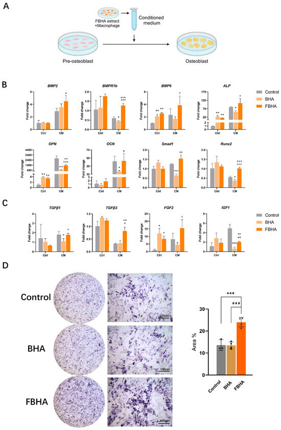 Osteogenic differentiation of pre-osteoblasts in FBHA and BHA. (A) In vitro model of material extract culturing with macrophages; RT-aPCR showed that (B) FBHA group upregulated the osteogenesis-related genes expression, and (C) osteogenesis-related growth factor gene expression. (D) ALP staining showed a significant enhancement of osteogenic differentiation in the FBHA group. p value: Compared with the Control group, *, p < 0.05; **, p < 0.01; ***, p < 0.001. Compared with BHA group, #, p < 0.05; ##, p < 0.01; ###, p < 0.001.
