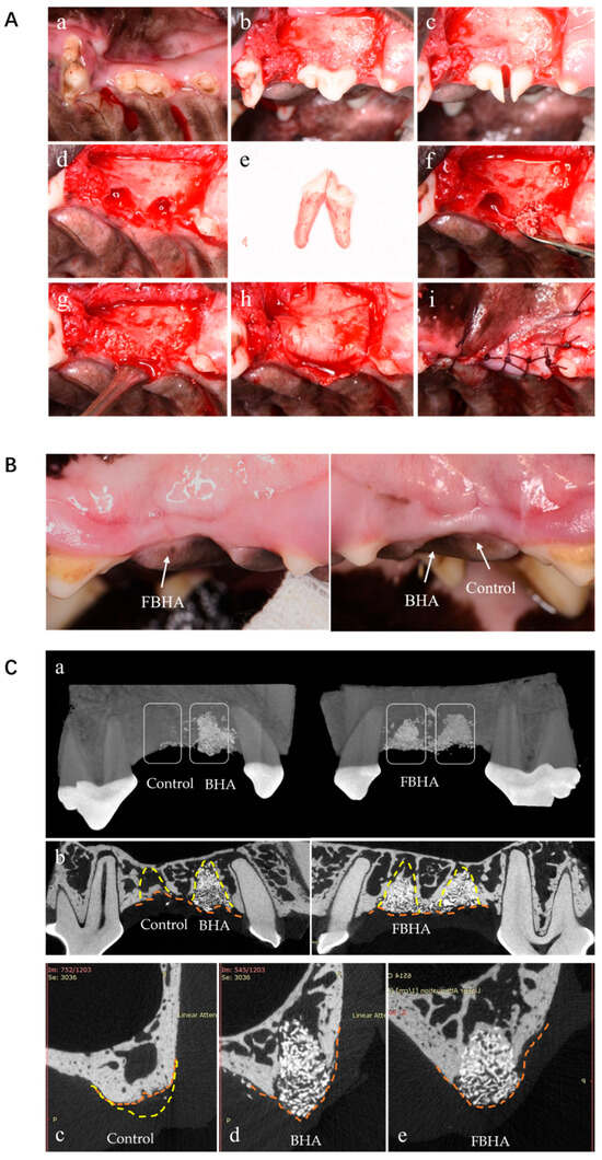 Socket preservation model in canine. (A) The establishment of an experimental animal model and surgery procedures, preoperative (a), flap reflection (b), tooth sectioning and extraction (c–e), bone grafting (f,g), collagen membrane placement (h), Suture (i), (B) The observation of the alveolar ridge contour and gingival healing status, (C) 3D reconstruction (a), sagittal (b) and coronal (c–e) plane observation of micro-CT showed collapsed contours in the Control group (c) and well-maintained alveolar contours in the BHA (d) and FBHA (e) groups. Yellow dashed line: Alveolar socket margin in (C(b)) and preconceived ridge contour in (C(c)); Orange dashed line: Alveolar ridge contour in (C(b–e)).