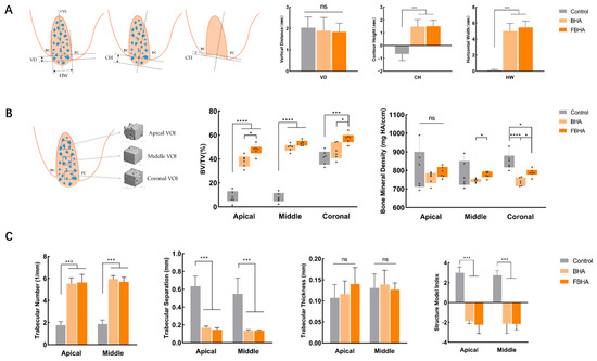 Micro-CT measurement analysis. (A) the alveolar bone contour measurement showed a well-restored bone contour in both the FBHA and BHA groups, (B) ROI analysis inside the sockets demonstrated that higher percentage of new bone formation and higher degree of bone mineralization were observed in the FBHA group, (C) Trabecular analysis indicated no significant difference between the BHA and FBHA groups. p value: *, p < 0.05; ***, p < 0.001, ****, p < 0.0001; ns, no significant difference.